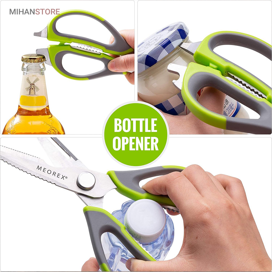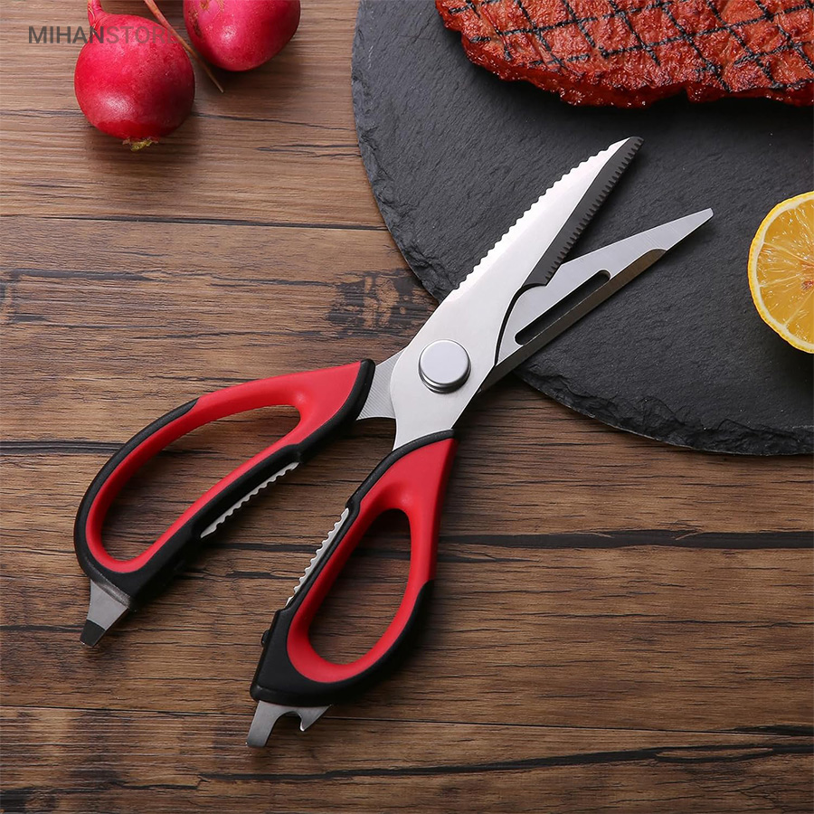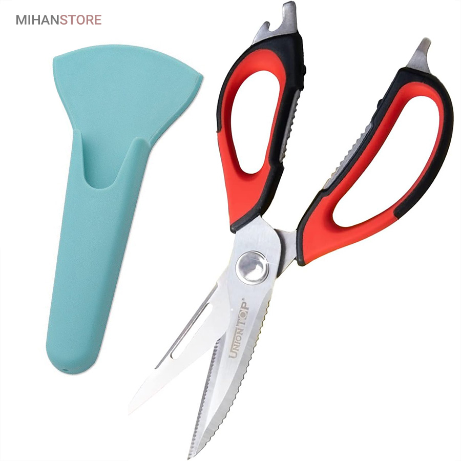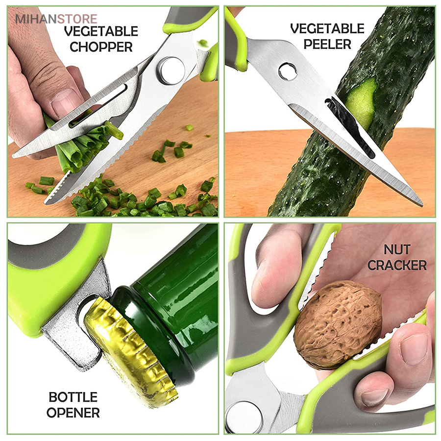 هم قیچی، هم بازکن، هم کابل کش و هم چاقو! این قیچی جادویی 8 کاره باورنکردنی در هر زمینه ای مفید خواهد بود. محصولی کاملاً جدید که باید در کار آشپزخانه خود داشته باشید و کار شما را آسان‌تر می‌کند و نمی‌توانید نزدیک آن باشید. در آشپزخانه می توانیم هنگام سرو مرغ، سبزیجات را خرد کنیم یا به راحتی استخوان ها را برش دهیم. می توانید از آن به عنوان کرکر فندقی یا گردو استفاده کنید. به راحتی می توانید درب بطری های خود را باز کنید. به طور خلاصه، به لطف قیچی جادویی 8 کاره، کاری که در زندگی روزمره انجام می دهید اکنون کاربردی تر شده است. قابل شستشو در ماشین ظرفشویی می باشد.
