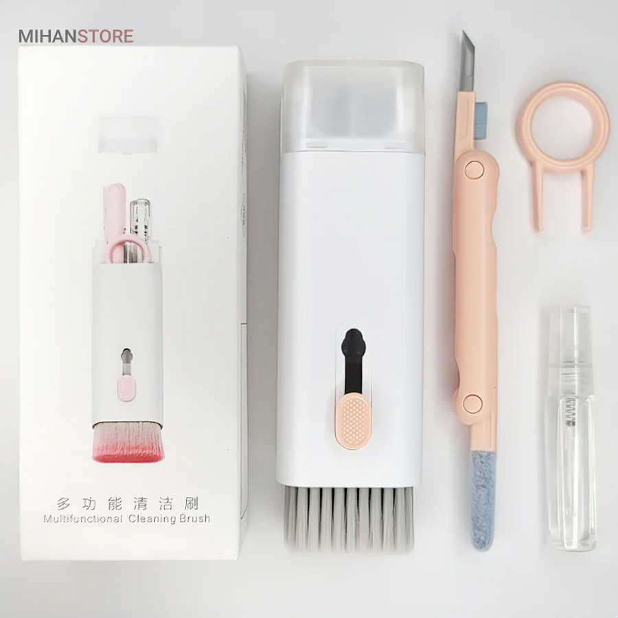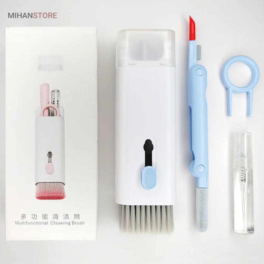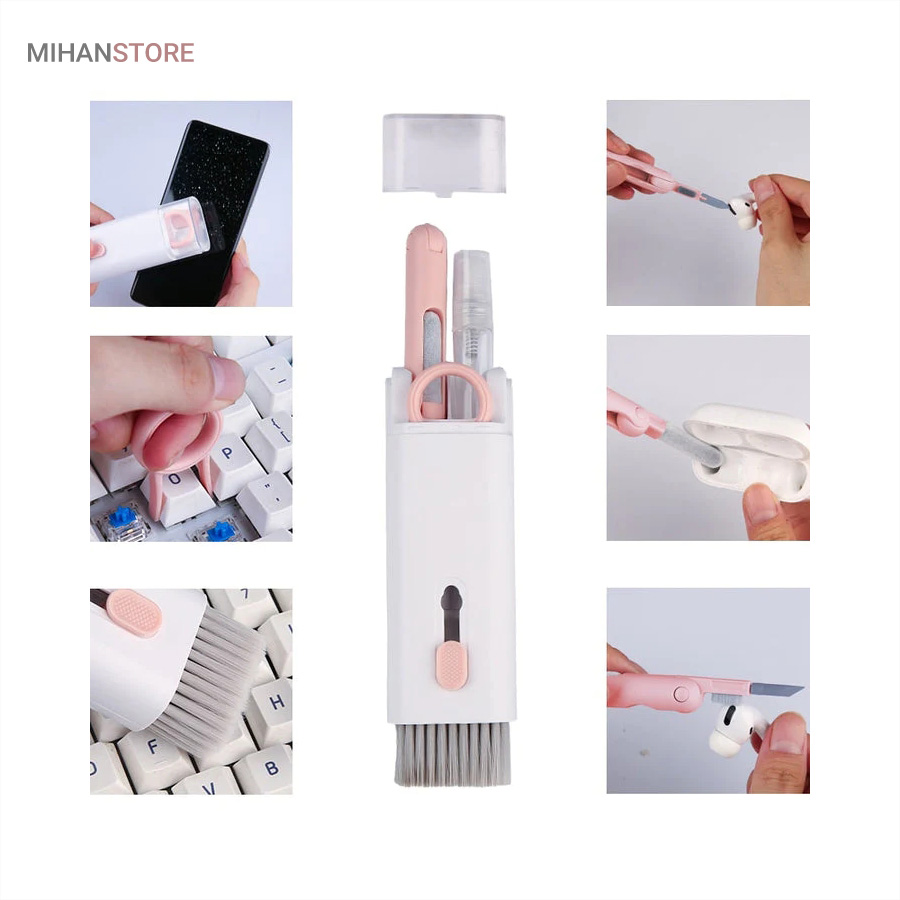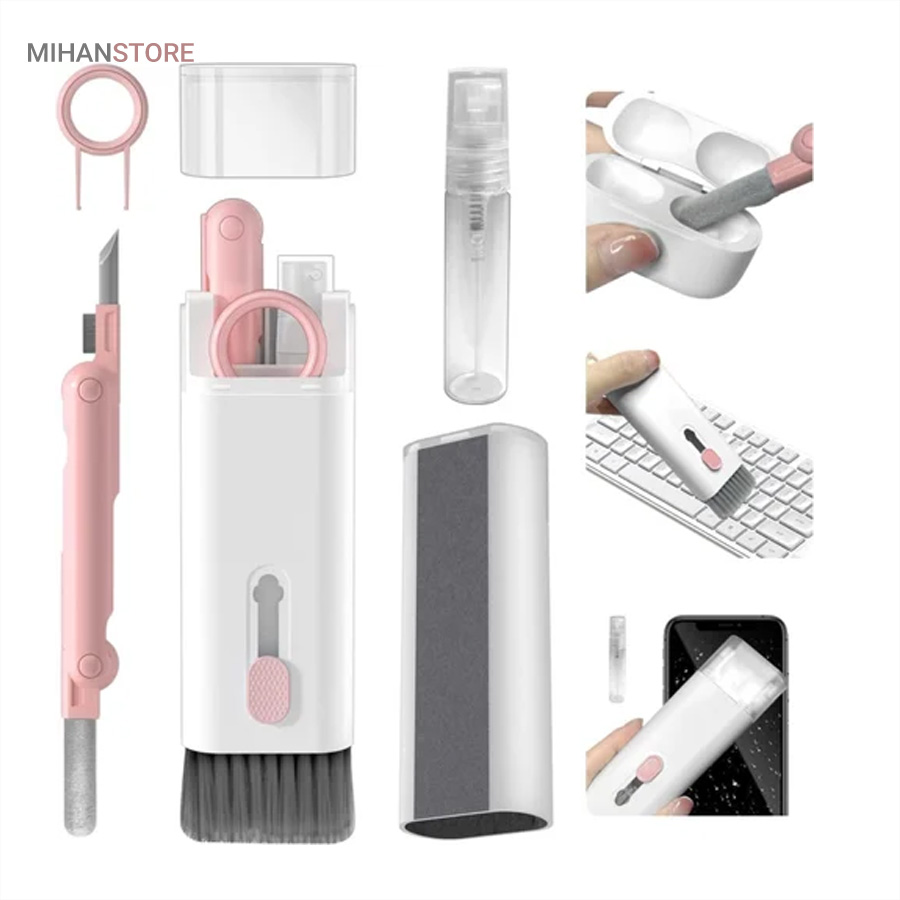 این کیت تمیزکننده 7 کاره شامل 1 برس بزرگ با تراکم بالا، 1 عدد پد تمیز کننده فیبری (مخصوص سطوح مانند مانیتور) ، 1 قلم تمیز کننده گوشی (شامل نوک فلزی، اسفنج و مینی برس با چگالی بالا)، 1 عدد کلیدکش کیبورد و 1 بطری اسپری می باشد. این سرویس پاک کننده چند منظوره می تواند هر خواسته شما را برای تمیز کردن وسایل الکترونیکی برآورده کند. اولین ابزار یک خودکار تمیزکننده تاشو با نوک سیلیکونی، برس کوچک سخت و اسفنج جمع‌کننده کثیفی ها ، مناسب برای تمیز کردن ایرپاد و سایر هدفون‌ها یا هندزفری ها. نوک سیلیکونی برای تمیز کردن لکه های شکاف است. دومین ابزار برس کوچک برای تمیز کردن گرد و غبار سطوح عمیق و اسفنج دسته دار برای تمیز کردن حفره های کیس شارژ  ایرپاد ها می‌باشد. ابزار سوم تمیز کننده لپ تاپ، رایانه، تبلت و صفحه کلید می باشد کافیست برس نرم بزرگ را بکشید تا گرد و غبار روی رایانه، لپ تاپ، تبلت و صفحه کلید پاک شود. و همچنین می توانید از کلیدکش کیبورد جدا کردن کلیدهای صفحه کلید مکانیکی برای انجام این کار استفاده کنید. ابزار بعدی تمیز کننده مانیتور، صفحه نمایش، دوربین، ساعت و تلویزیون میباشد: در کنار یک بطری خالی اسپری 5 میلی‌لیتری، مایع تمیزکننده یا آب را درون بطری قرار می‌دهید و از صفحه فیبری برای تمیز کردن صفحه‌های مختلف استفاده می‌کنید. به عنوان مثال صفحات نمایش ، تلویزیون، ساعت، دوربین و غیره.اندازه جمع و جور و سبک وزن: 7 ابزار تمیز کردن کامپیوتر به طور مرتب در یک جعبه مستطیلی قرار گرفته اند. اندازه کیت پاک کننده فقط 4.88 * 1.73 * 1.18 اینچ و وزن آن تقریبا 80 گرم است. برای سفر به اندازه کافی کوچک است و می توانید آن را حمل کنید. در همین حال، شما همچنین می توانید هر ابزار تمیز کننده ای را به طور جداگانه بیرون بیاورید.