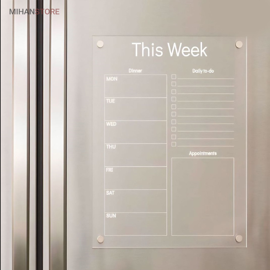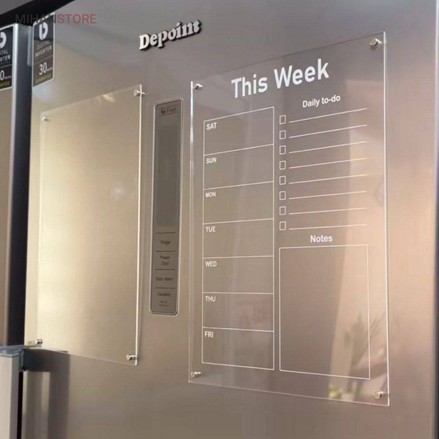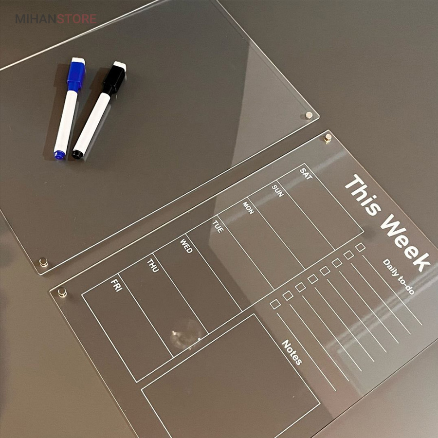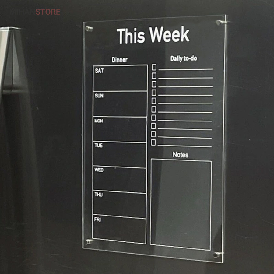 تخته برنامه ریزی هفتگی مغناطیسی شفاف این امکان را به شما می دهد تا با داشتن یک برنامه ی منظم هفتگی کارهای خود را سازمان دهی کنید.همچنین با داشتن بخش جزییات کارهای روزانه به شما در طبقه بندی، رسیدگی و انجام کارهای تان کمک می کند. امکان ثبت رویداد های هفته ،ثبت قرار ملاقات و دارا بودن بخش یادداشت های متفرقه از مزیت های این محصول است . پلکسی گلس اجرا شده در این محصول به ضخامت دو میلی متر است و در آن چهار عدد آهن ربای نئودیمیوم درجه یک بکار رفته است . آهن ربای این محصول با قدرت بالا نسبت به وزن محصول احتمال سرخوردگی را به صفر می رساند. طرح چاپ شده در دو رنگ سفید و مشکی در پشت پلکسی گلس اجرا شده است. با یک ماژیک وایت برد قابلیت نوشتن و پاک کردن مکرر روی این تخته وجود دارد.