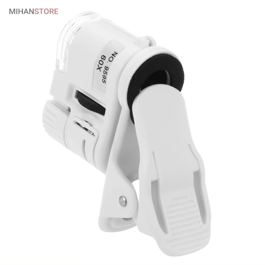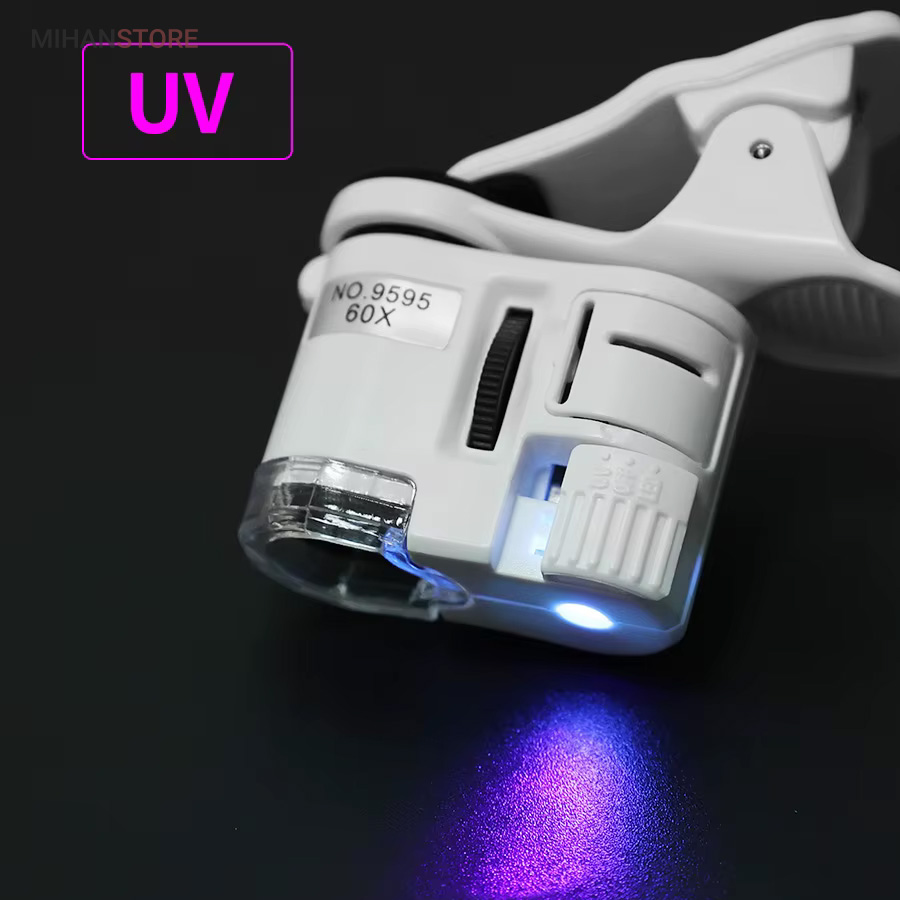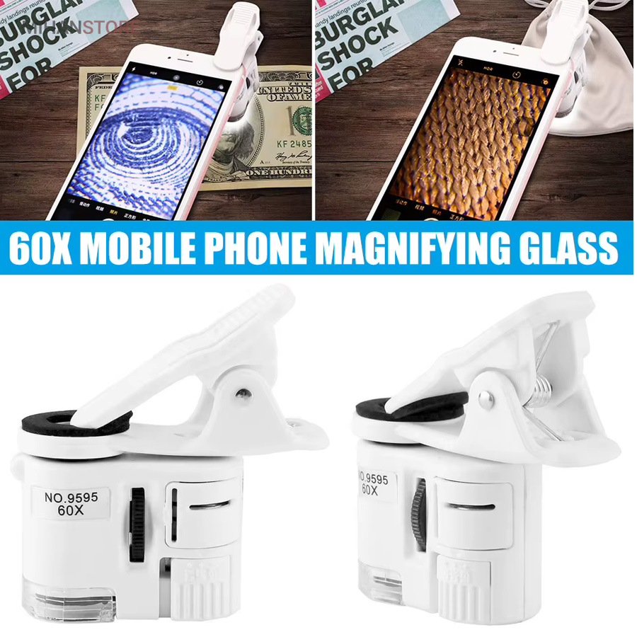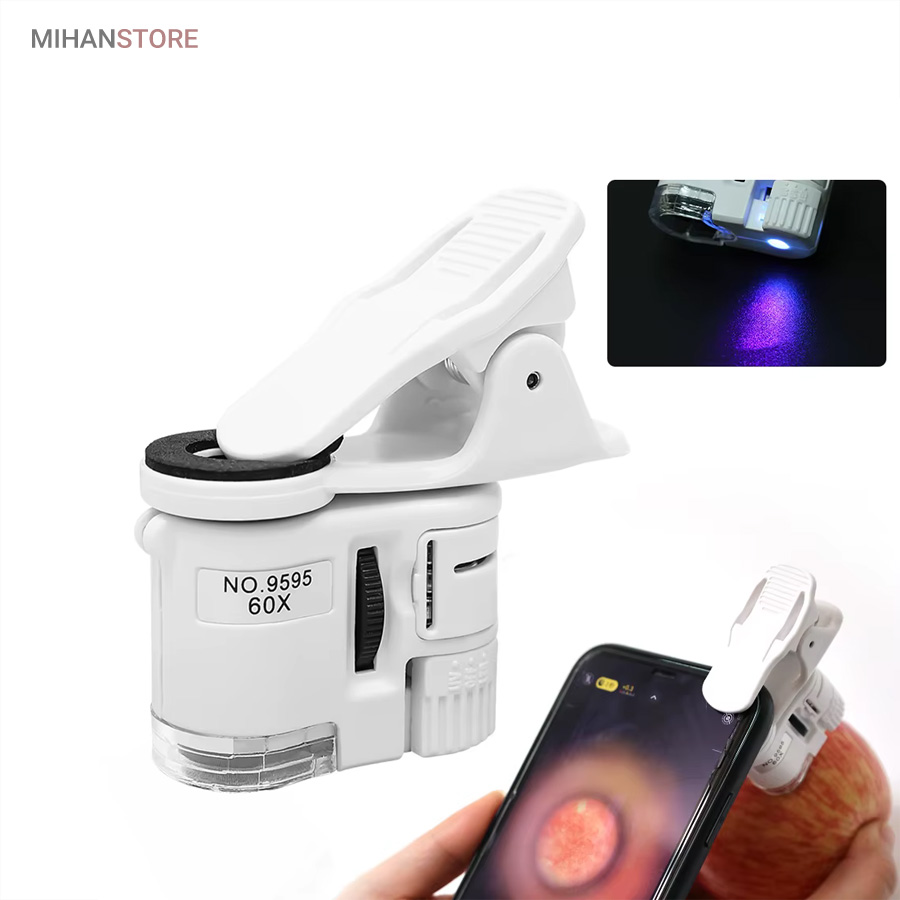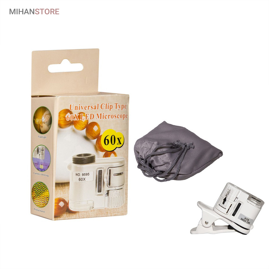 میکروسکوپ موبایل 60x یونیورسال مدل 9595 ذره بینی کوچک و قابل حمل در جیب با زوم 60 برابر و مدل کلیپسی گیره دار مناسب اتصال به گوشی موبایل میباشد.موبایل های هوشمند امروزی از بسیاری از کامپیوتر های چند سال قبل هم سریع تر و هم قوی تر شده اند از این رو هر روزه گجت های متنوع و کاربردی فراوانی مخصوص موبایل طراحی شده و معرفی می شوند.این میکروسکوپ موبایل با بزرگنمایی 60 برابر در واقع یک لنز مخصوص موبایل است که به همراه کلیپس خود می تواند بروی دوربین انواع موبایل نصب شده و دوربین موبایل رو به یک میکروسکوپ تبدیل کند. پس اگر به دنبال میکروسکوپ قابل حمل هستید، این گجت گزینه مناسبی می باشد.این میکروسکوپ موبایل با قدرت بزرگنمایی 60 برابری، دارای قیمت ارزان و کیفیت قابل قبولی می باشد و دارای توان مصرفی پایینی است که امکان نصب بر روی انواع تلفن همراه و تبلت ها قابل نصب می باشد.از آنجائیکه منبع نور این دستگاه درست در امتداد لنز اصلی آن قرار داشته و نور از بالا بروی نمونه تابیده می شود از این رو برای رویت سطح هر جسمی میتوان از آن استفاده نمود مانند سطح کاغذ، سطح برگ، مشاهده مدارهای الکترونیکی (مدار چاپی)، مشاهده جواهرات و سنگ های قیمتی، مشاهده امور مختلف زمین شناسی ، استفاده برای صنعت چاپ و دهها صنعت دیگر.دارای دو عدد چراغ LED می باشد که یکی از آنها سفید و برای روشن کردن زمینه بوده و چراغ دوم نور آبی UV جهت تست اسکناس می باشد.قسمت بالائی این ذره بین همانند تلسکوپ یا دوربین تک چشمی بصورت طولی بزرگ و یا کوچکتر می شود؛ و امکان زوم را میدهد.کلید این ذره بین دو حالته می باشد و با باطری کوچک ساعت کار می کند و بسیار کم مصرف است.فاصله ای که از جسم مورد نظر باید گرفت تا واضح دیده شود مماس تا 1 سانتی متر میباشد.