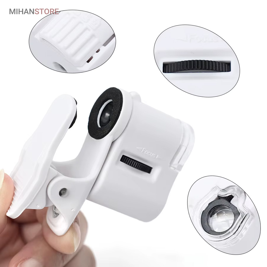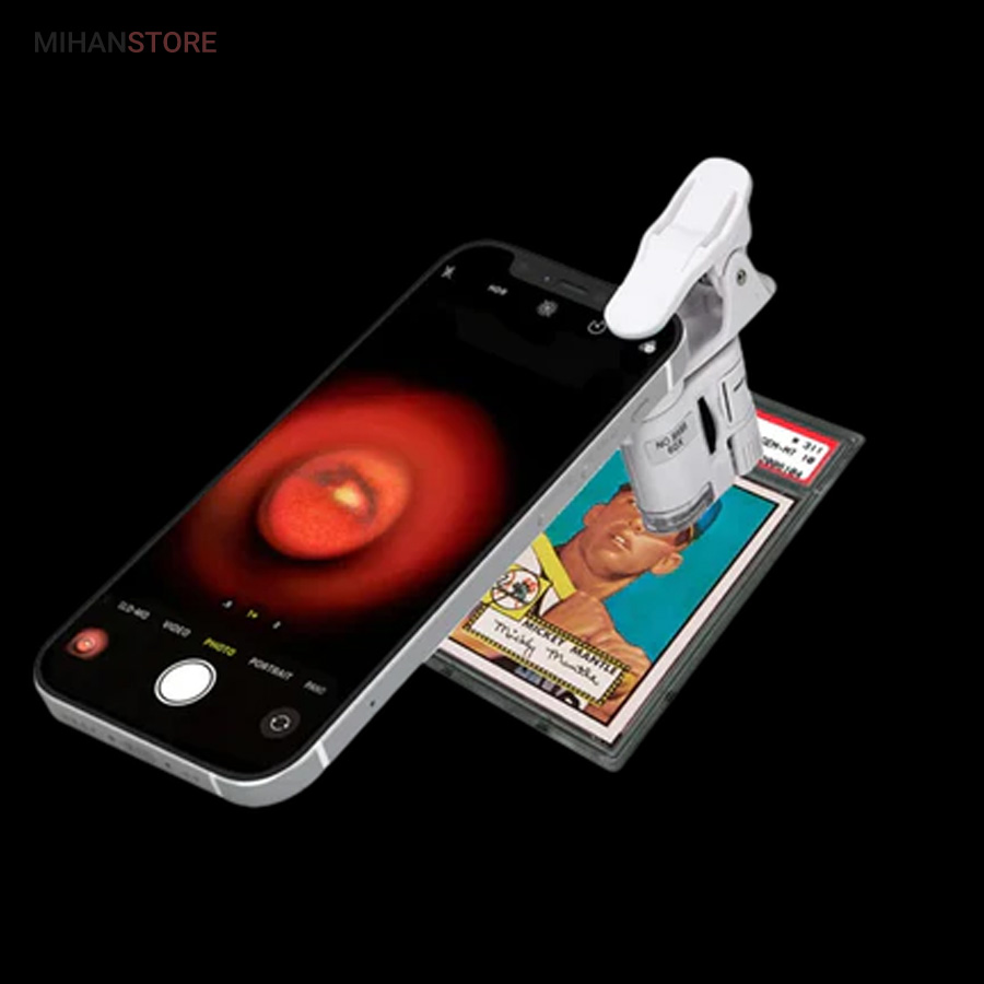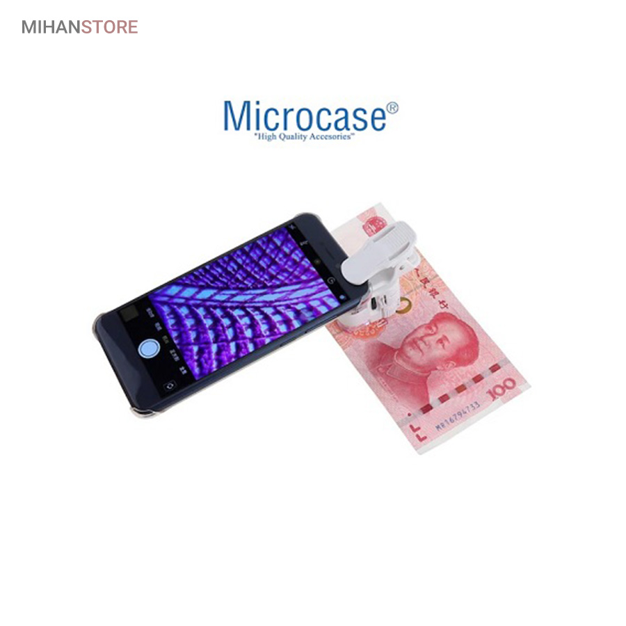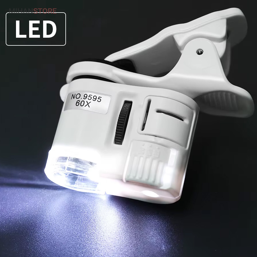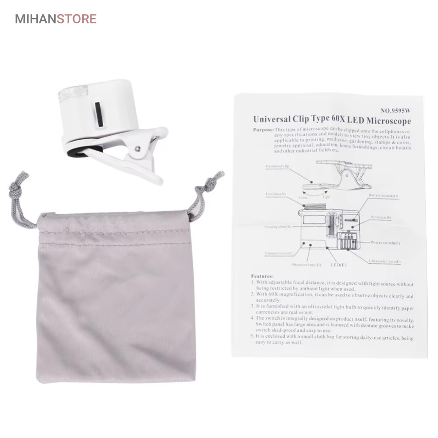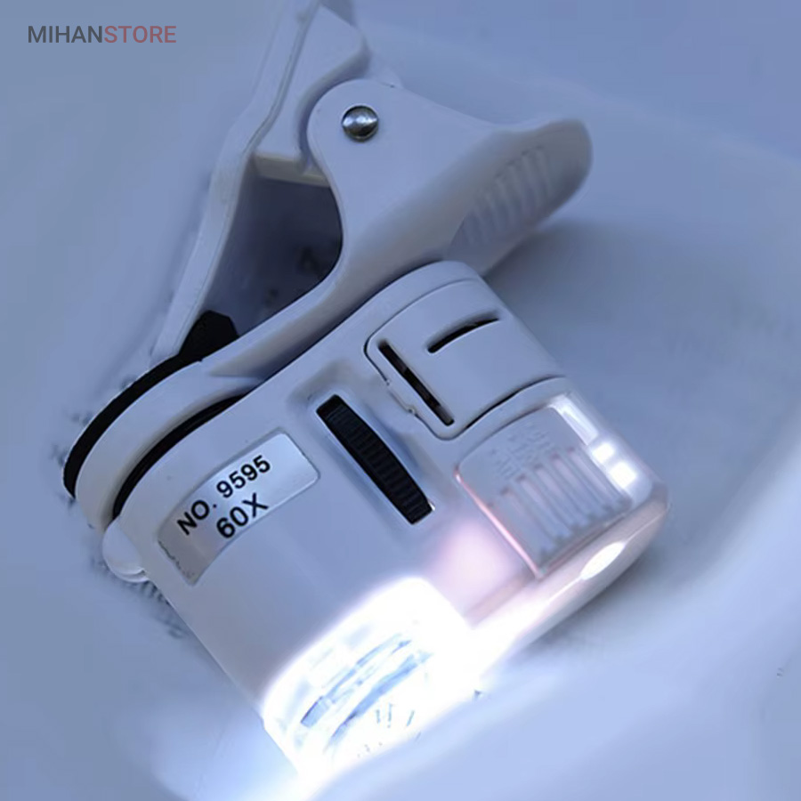 میکروسکوپ موبایل 60x یونیورسال مدل 9595 ذره بینی کوچک و قابل حمل در جیب با زوم 60 برابر و مدل کلیپسی گیره دار مناسب اتصال به گوشی موبایل میباشد.موبایل های هوشمند امروزی از بسیاری از کامپیوتر های چند سال قبل هم سریع تر و هم قوی تر شده اند از این رو هر روزه گجت های متنوع و کاربردی فراوانی مخصوص موبایل طراحی شده و معرفی می شوند.این میکروسکوپ موبایل با بزرگنمایی 60 برابر در واقع یک لنز مخصوص موبایل است که به همراه کلیپس خود می تواند بروی دوربین انواع موبایل نصب شده و دوربین موبایل رو به یک میکروسکوپ تبدیل کند. پس اگر به دنبال میکروسکوپ قابل حمل هستید، این گجت گزینه مناسبی می باشد.این میکروسکوپ موبایل با قدرت بزرگنمایی 60 برابری، دارای قیمت ارزان و کیفیت قابل قبولی می باشد و دارای توان مصرفی پایینی است که امکان نصب بر روی انواع تلفن همراه و تبلت ها قابل نصب می باشد.از آنجائیکه منبع نور این دستگاه درست در امتداد لنز اصلی آن قرار داشته و نور از بالا بروی نمونه تابیده می شود از این رو برای رویت سطح هر جسمی میتوان از آن استفاده نمود مانند سطح کاغذ، سطح برگ، مشاهده مدارهای الکترونیکی (مدار چاپی)، مشاهده جواهرات و سنگ های قیمتی، مشاهده امور مختلف زمین شناسی ، استفاده برای صنعت چاپ و دهها صنعت دیگر.دارای دو عدد چراغ LED می باشد که یکی از آنها سفید و برای روشن کردن زمینه بوده و چراغ دوم نور آبی UV جهت تست اسکناس می باشد.قسمت بالائی این ذره بین همانند تلسکوپ یا دوربین تک چشمی بصورت طولی بزرگ و یا کوچکتر می شود؛ و امکان زوم را میدهد.کلید این ذره بین دو حالته می باشد و با باطری کوچک ساعت کار می کند و بسیار کم مصرف است.فاصله ای که از جسم مورد نظر باید گرفت تا واضح دیده شود مماس تا 1 سانتی متر میباشد.