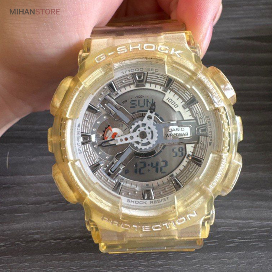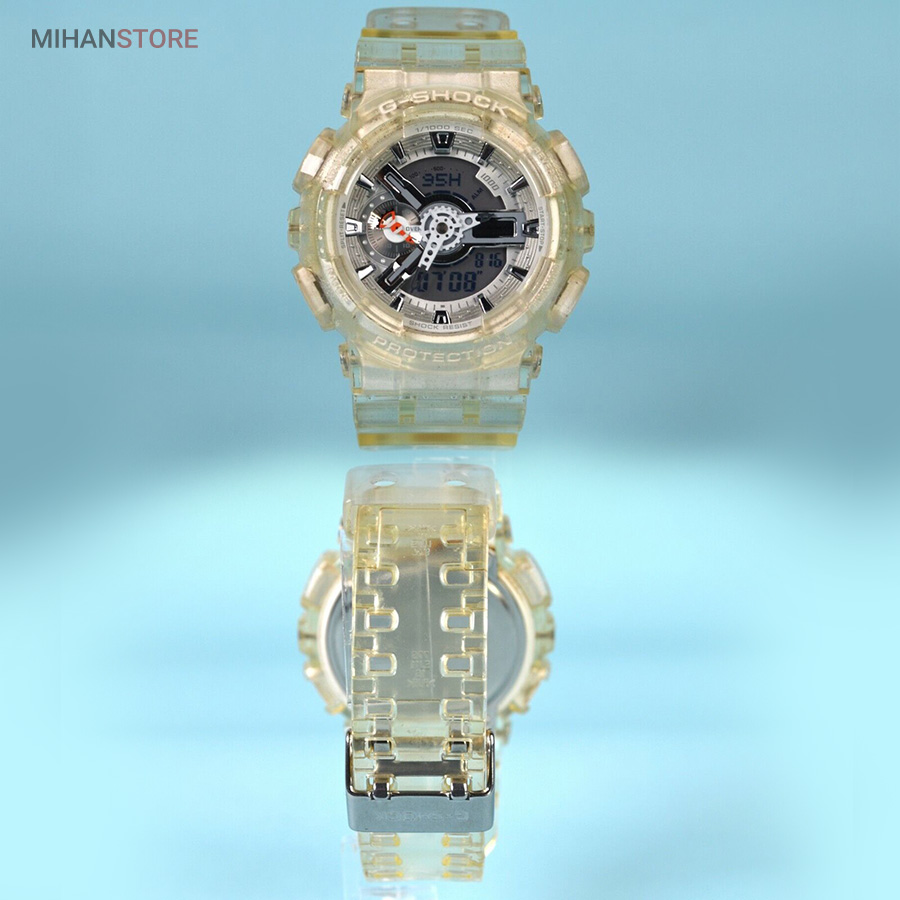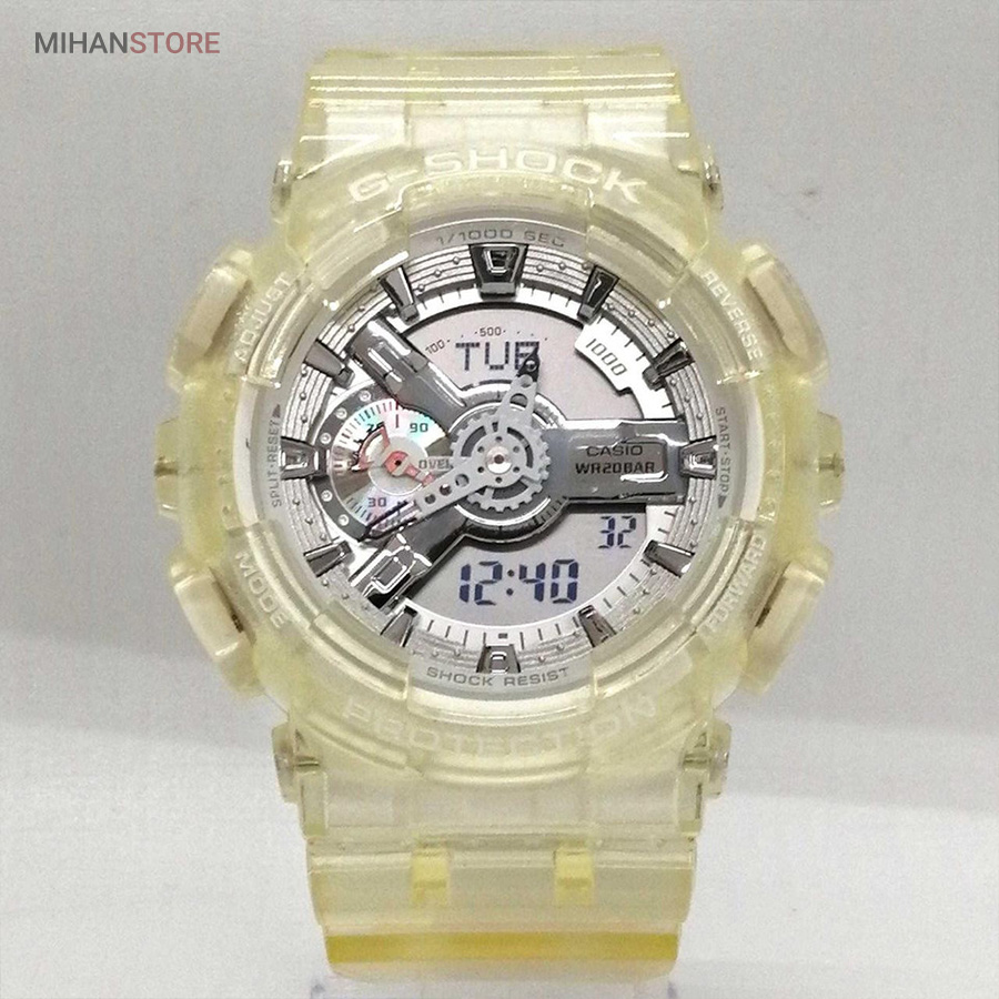 G-SHOCK عناصر دنده ای شکل عمقی سه بعدی ایجاد می کنند و عقربه های آنالوگ به G-SHOCK جلوه قوی و قدرتمند آن را می دهند. G-SHOCK به گونه ای طراحی و ساخته شده است که علاوه بر استحکام مطلق و ضد ضربه بودن، در برابر آب تا 20 بار نیز مقاوم بوده و همچنین دارای خواص ضد مغناطیسی برای زمان دقیق می باشد. GA-110 همچنین دارای بسیاری از عملکردهای مفید مانند زمان جهانی، کرونومتر، تایمر شمارش معکوس و هشدارهای روزانه است.